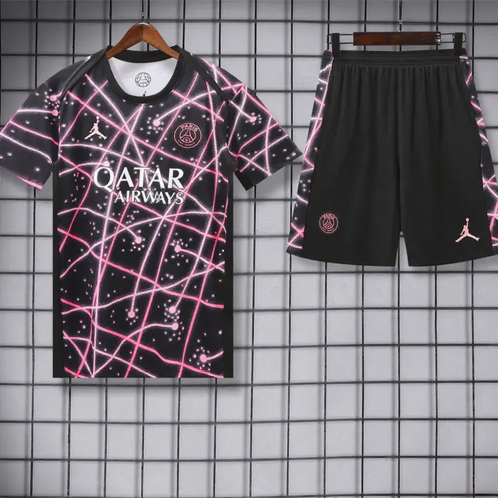 Paris Saint-Germain PSG 25-26 Short-Sleeve Training Set - Pink Fluorescent Rays Black Top & Black Shorts